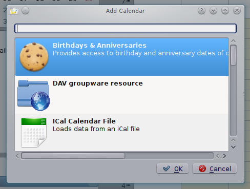 Then you can open korganizer (or kontact) and right click the calendar manager and choose Add Calendar. It will give you a list of resources like this: